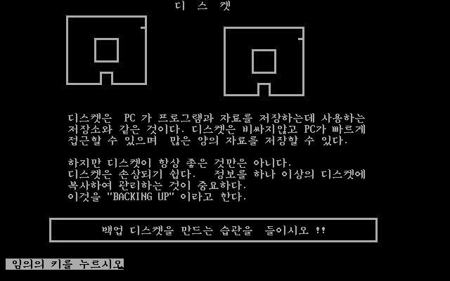 대우전자의 MSX2 아이큐2000에 내장되어있는 아이큐교실 (MSX-TUTOR) 이 MSX베이직을 위주로 다뤘다면 이 컴퓨터교실 (PC-TUTOR) 에서는 MS-DOS 를 중심으로 하고 있습니다. 1989년 제작이네요.